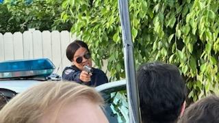 Now, I had to worry about forcefully driving this big a*s boat of a car, into this tiny narrow drive without crashing, denting, or scratching this rental or anything near me. I also had to remember how all the buttons and doohickeys worked to make the lights flash and the sirens blare. Mind you, all the cast and crew were watching me. So, I had to look good doing it! No pressure at all. Luckily, I had scene partner Mark who plays officer Volibear along for the ride. Mark was joy to work with and he was huge help in making that shot successful. On set, you can only freak out for so long, because next thing you know, lickety split, you are behind the wheel of police car with your director yelling action. I focused myself because it was time to do the damn thing.